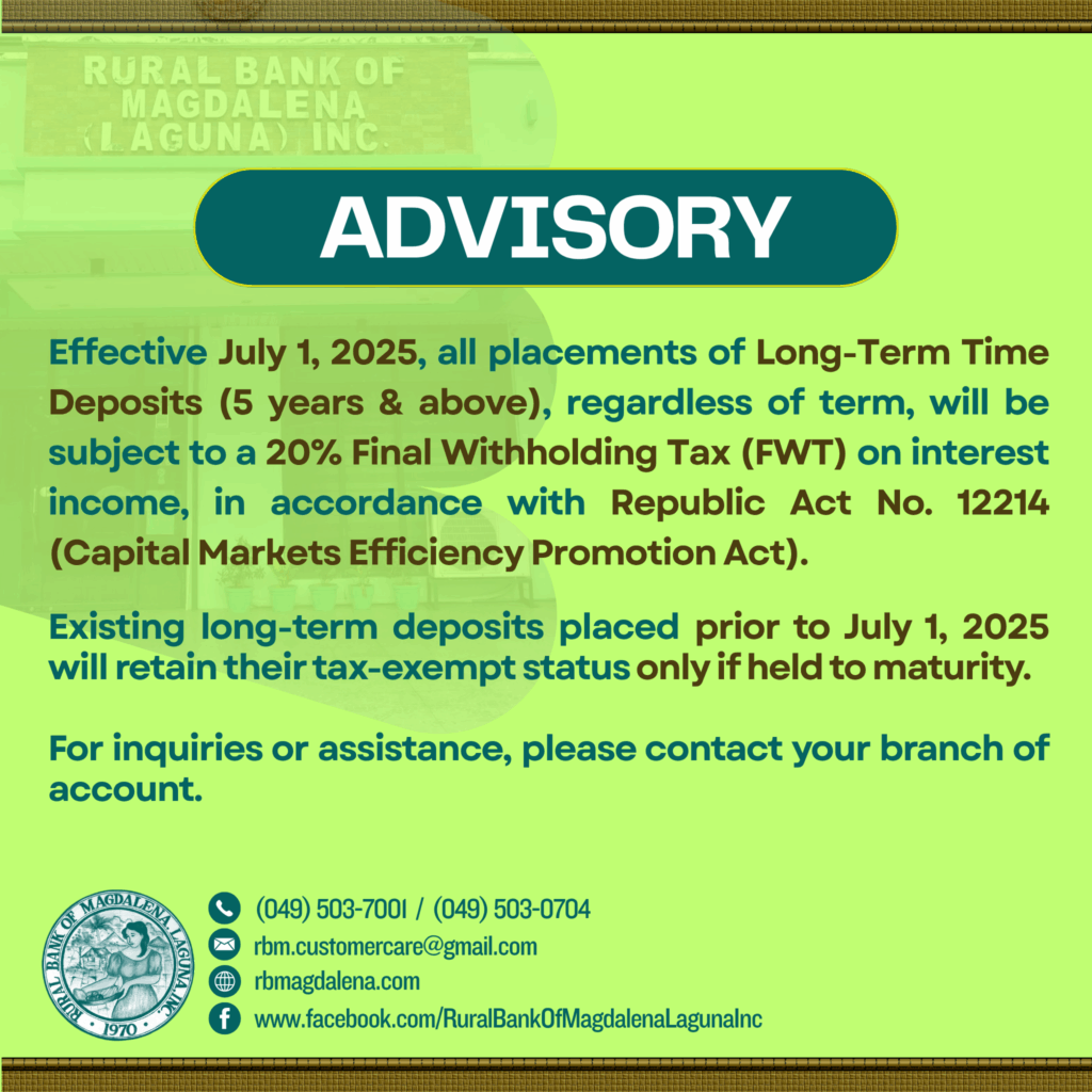 Deposits are insured by PDIC up to ₱ 1,000,000 per depositor. Rural Bank of Magdalena (Laguna), Inc. is regulated by the Bangko Sentral ng Pilipinas (BSP).